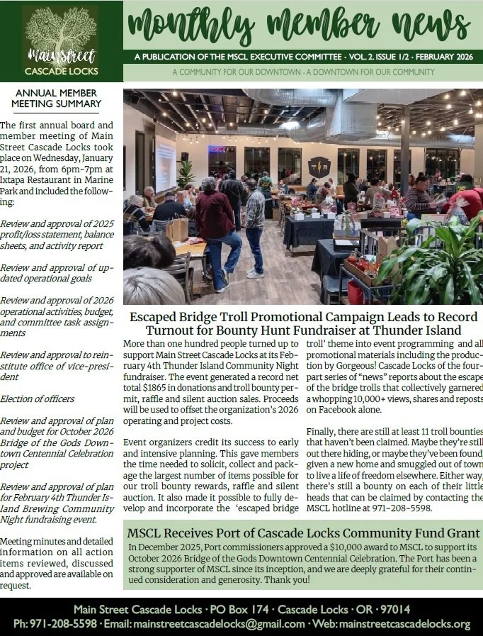 More than one hundred people turned up to support Main Street Cascade Locks at its February 4th Thunder Island Community Night fundraiser. The event generated a record net total $1865 in donations and troll bounty permit, raffle and silent auction sales. Proceeds will be used to offset the organization’s 2026 operating and project costs.